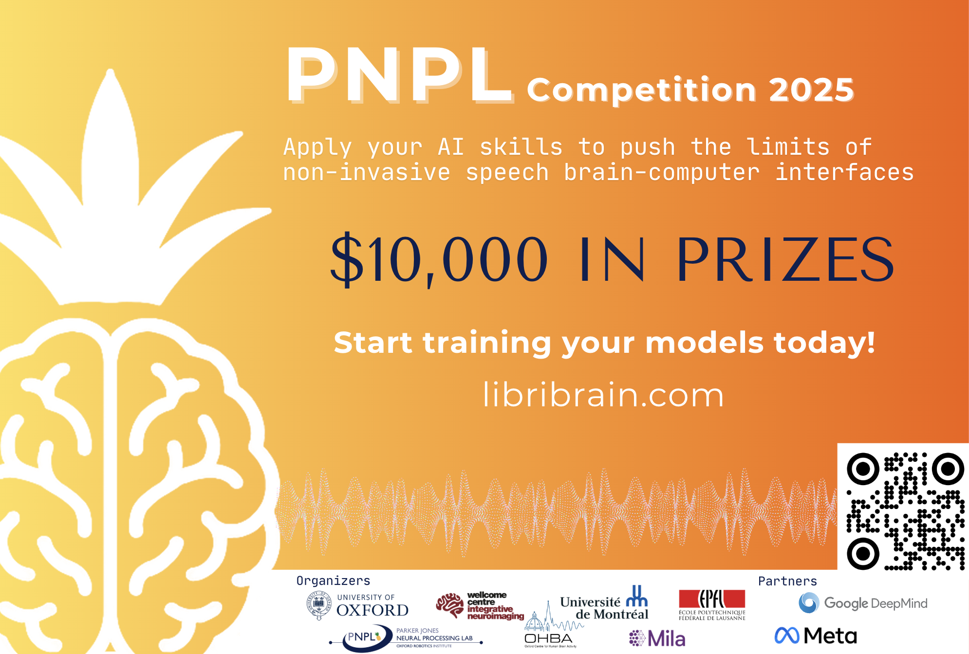 2025 PNPL Competition – Push the Boundaries of non-invasive speech BCIs 🔍 Decode speech from brain MEG data with our Python SDK (*pip install pnpl*) - no prior neuroscience knowledge required. 🗓️ Two tasks: Speech Detection (Jun 1–Jul 31) • Phoneme Classification (Aug 1–Sep 30). 🎓 Organized by the *Neural Processing Lab (PNPL) <https://urldefense.com/v3/__https://neural-processing-lab.github.io/__;!!PvDODwlR4mBZyAb0!Qv77ch45ZYWV8h6PTv9V5twuaKgMQmNSb2tqvQOnMWGt8FvXUXvzAlQ7ZE2Xa2VVwxtAFiMdhAb7W1eMQRr7aZSTLKnotprk0w$>*, University of Oxford and our partners. 🏆 $10.000+ in prizes + opportunity to have your work showcased at NeurIPS 2025. 📝 More details in the paper: *https://arxiv.org/abs/2506.10165 <https://urldefense.com/v3/__https://arxiv.org/abs/2506.10165__;!!PvDODwlR4mBZyAb0!Qv77ch45ZYWV8h6PTv9V5twuaKgMQmNSb2tqvQOnMWGt8FvXUXvzAlQ7ZE2Xa2VVwxtAFiMdhAb7W1eMQRr7aZSTLKkvNuDh0w$>* 👩💻 Get started today: *http://libribrain.com/ <https://urldefense.com/v3/__http://libribrain.com/__;!!PvDODwlR4mBZyAb0!Qv77ch45ZYWV8h6PTv9V5twuaKgMQmNSb2tqvQOnMWGt8FvXUXvzAlQ7ZE2Xa2VVwxtAFiMdhAb7W1eMQRr7aZSTLKml8FFwNw$>* Summary on Twitter X: https://x.com/oiwi3000 <https://urldefense.com/v3/__https://x.com/oiwi3000__;!!PvDODwlR4mBZyAb0!Qv77ch45ZYWV8h6PTv9V5twuaKgMQmNSb2tqvQOnMWGt8FvXUXvzAlQ7ZE2Xa2VVwxtAFiMdhAb7W1eMQRr7aZSTLKkBxB3rRQ$>